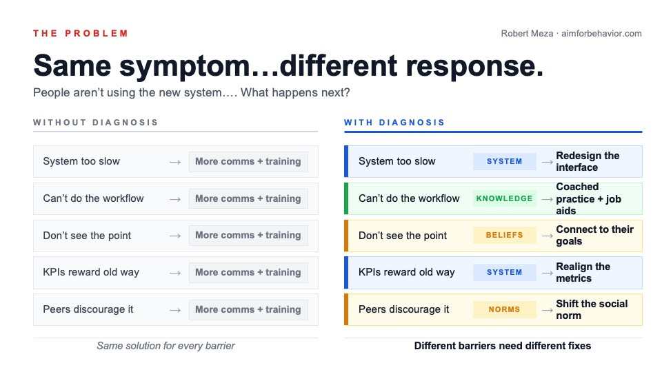 Now, I know what some of you are thinking… well ADKAR does separate Knowledge from Ability. That’s fair, however, there’s a real difference between putting a label on a gap and diagnosing its mechanism. When ADKAR says there’s a “Desire” gap, it gives you engagement tactics, but It doesn’t tell you whether that gap is missing purpose, identity threat, or social isolation. And those are very different problems that need very different fixes. “Desire is low” is a label, not a diagnosis. A label tells you where the problem is, but a diagnosis tells you what to do about it.