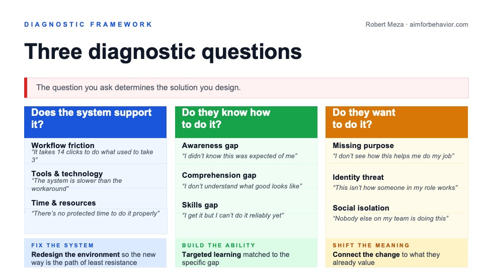 Run the 3-question diagnostic. For that behavior: Does the system support it? Do they know how to do it? Do they want to do it? Write down your insights for each.
