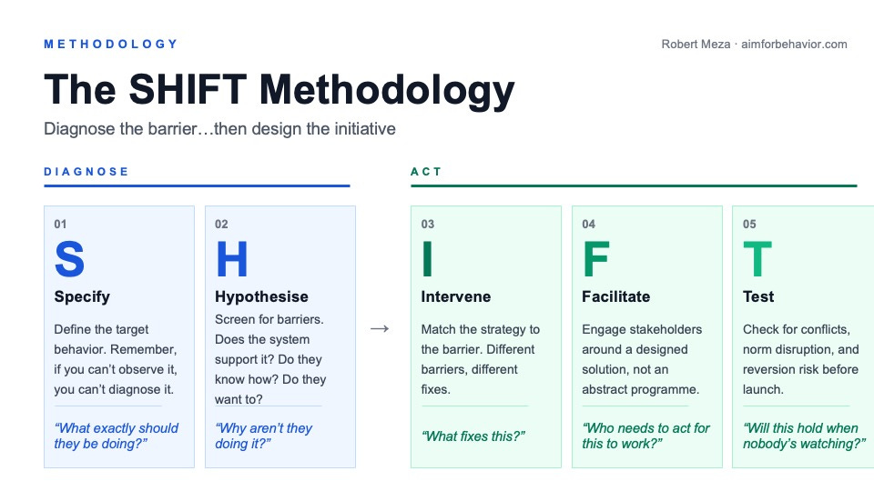 SHIFT stands for Specify, Hypothesise, Intervene, Facilitate, Test. It’s my behavioral/implementation science methodology for organisational change that starts from a different place than the traditional ones it asks: